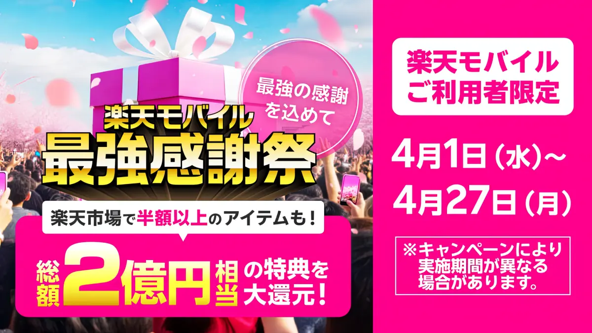 楽天モバイルは4月1日より、楽天モバイルの利用者を対象に総額2億円相当の特典を還元する「楽天モバイル 最強感謝祭」を開始しました。楽天グループの様々なサービスで利用できる多彩なクーポンやポイント高還元など、20以上の特典があります。