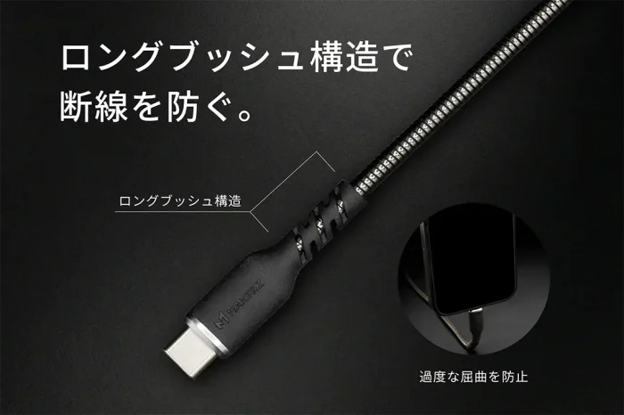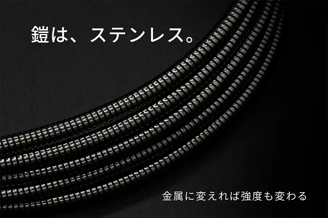 最大の特徴は外皮がステンレス製ということ。金属スパイラル構造がケーブル内部のワイヤーを覆い、人や家具に踏まれても、ペットに噛まれても断線しにくい設計です。