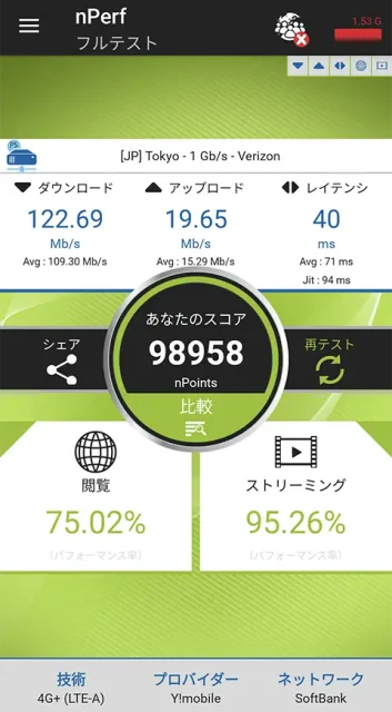 | ソフトバンク回線 | 100.7Mbps | 89,229pt |