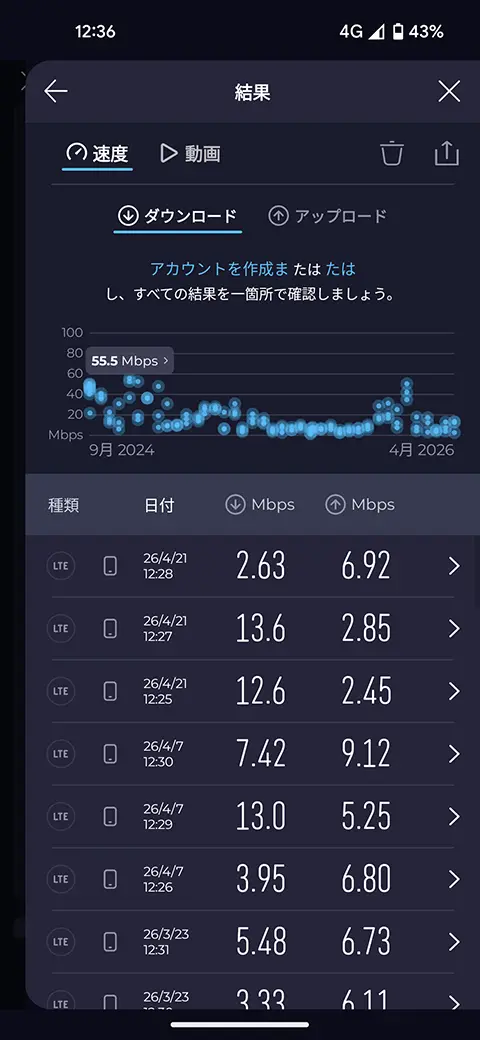 結果リストの上に表示されている青い点はそれぞれの測定結果です。横軸が日付で縦軸が速度です。上図の左側はいつ測定してもだいたい同じ値で安定していますが、右側は日によってもばらつきがありますし、同じ時間の測定でもばらつきがあって安定してません。