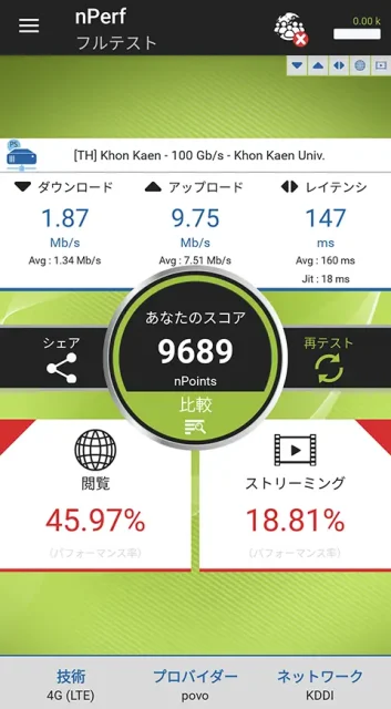 少し良くなったりまた落ちたりを繰り返しているpovoです。今回はSpeedtest.netはともかくnPerfがかなり落ちています。UQ mobileの値ともけっこう差が出てきています。うーん…。