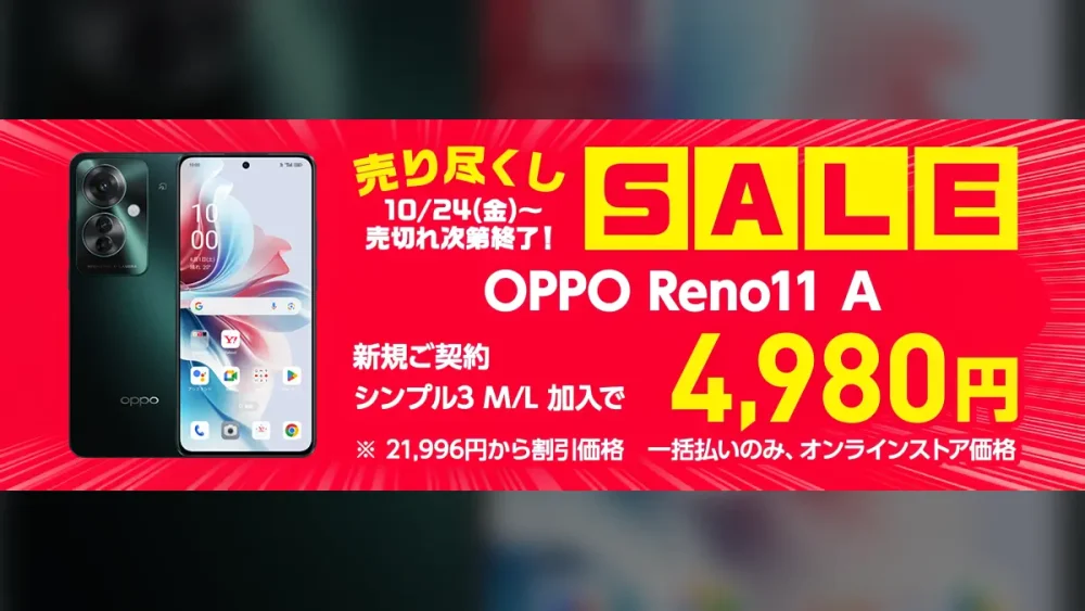 OPPO Reno11 Aが新規一括4,980円!ワイモバイルオンラインストアにて売り尽くしセール開催!