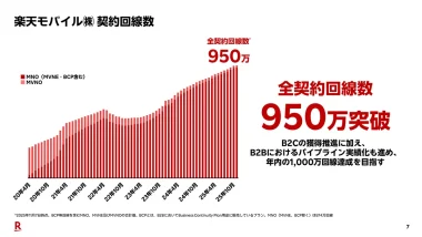 楽天モバイル、全契約回線数が950万まで増加!MNOだけでも874万回線
