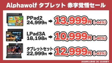 10インチタブレットAlphawolf LPad2が10,999円、11インチAlphawolf LPad3が12,999円のセール中!